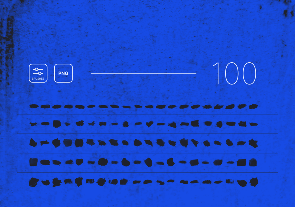 Handmade grunge brushes with a heavy paper texture. Suitable for both print and digital use. The package consists of 5 folders, each of which contains one ABR file containing a group of 20 brushes, as well as 20 PNG files.